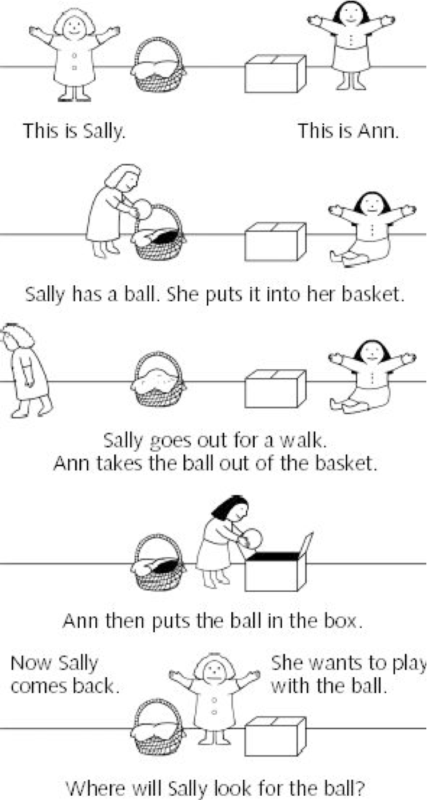 Although Amsterdam's results were from a small sample size, they have subsequently been repeated with many more participants. Also, later studies with control conditions have found infants in this age-range don't touch their nose if it isn't marked with rouge. This showed that touching the nose isn't somehow a natural reaction for infants to seeing own reflection. Self-concept or just self-recognition? Of course this study simplifies a mass of psychological complexity. Psychologists have raised all sorts of questions about what the mirror test reveals. It could be, for example, that infants just don't understand faces particularly well until they are around two years old. Perhaps, then, they develop a self-concept at a much earlier stage. Alternatively it could be that at around two years old infants develop a solid physical or visual self-concept, but still have little mental self-concept. In this case all the test is showing is that we know what we look like; perhaps we don't develop our self-concept until much later in life. Results are especially ambiguous because only limited tests can be carried out on children. These are just two common explanations, I'm sure you can think of more alternatives. This multitude of possibilities illustrates one of the major hurdles in child psychology: results are especially ambiguous because only limited tests can be carried out on children. Still, despite these alternatives, the mirror test has proved remarkably hardy over the years and is still used today while other tests have fallen by the wayside. The social child One of the reasons for its resilience is that it seems likely that self-concept might well emerge at this age from all the other things we know about children. It is from around 2 to 4 years of age that children start to display a rapid increase in their social behavior. Being able to distinguish yourself from other people is fundamental to successful social relationships rather than simple interactions. It seems unlikely that infants would be able to build relationships with others without some limited concept of themselves. Being able to distinguish yourself from other people is fundamental to successful social relationships. The mirror test has also been used on other animals to test their self-concept, indeed the test was originally carried out on chimpanzees by Professor Gordon Gallup a few years before Amsterdam. All the great apes 'pass' the test, along with dolphins, whales and elephants. In one recent study an 8ft mirror was placed in the elephant enclosure at New York's Bronx Zoo and the elephants had marks painted on their heads. Researchers who kept watch on the elephants' reactions saw them touch the paint marks on their own heads. It's no coincidence that elephants, like the other animals that pass the test, have complex social systems. Basic self-recognition is key to being able to relate to others; with this knowledge infants take their first faltering steps into the social world. (http://www.spring.org.uk/2008/05/when-self-emerges-is-that-me-in-mirror.php) Theory of Mind As children gain insight into themselves they also begin to realize that people have thoughts, beliefs, and intentions. They also begin to understand that thoughts, beliefs, and intentions often cause people to behave the way they do. This is the first appearance of "perspective taking" which is a critical part of moral development...which we will study later in this class. Between the ages of 2 and 5 children develop Theory of Mind. TOM is defined as a naive understanding of the relationship between a person's mind and their behavior. Consider the following experiment:
