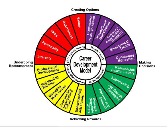 Teaching As is noted in the title of this chapter, here we are talking about Occupation and Lifestyle. Two very major issues relevant to Erikson's age of Generativity (typically mid-life, but we encounter these decisions through young adulthood as well) Work In my Sociology class we talk about Status and Roles in society. The Status (in Sociology) is the "Job Title" while the Role (in Sociology) is the "Job Description". We all have multiple "Statuses" and each has a "Role" or job description...it is "what we do". It is a HUGE part of our identity in this culture. In fact, when you meet someone what is the first question you ask after you have their name (at least most of the time)....? "What do you do?" The importance of the decisions we make about "what we do" (either work or play/leisure) are critical in how we see ourselves (identity) and how others see us (social status). Career Development Model Another model sees Career Development as cyclical...the graphic below represents the steps individuals take in getting into new careers. This model is particularly important as we realize that many people have multiple careers in their lives.