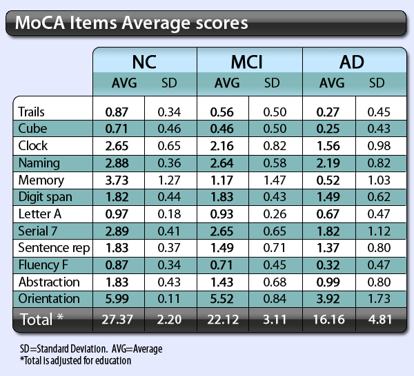 This chart represents the average scores on the MoCA for Normal, Mild Cog Impairment, and Alzheimer's Patients