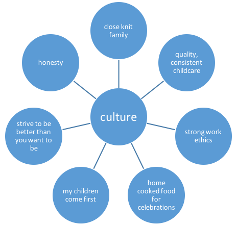 I have adjusted the questions to include MORE than just thinking. I want you to actually use the graphic to recall how you grew up and adapt it to reflect your own view of culture. Answer the questions according to the following.