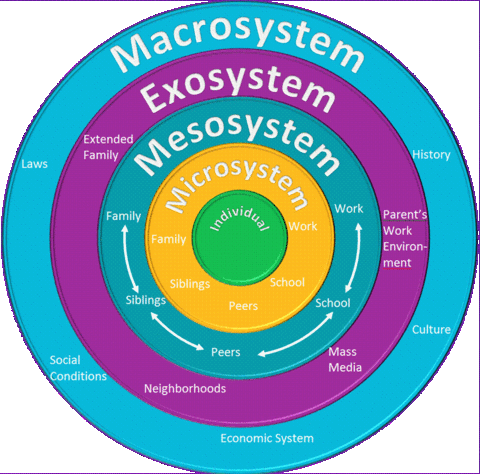 This model is actually a developmental model of human development. As persons age and experience the world, the different concentric circles of influence begin to have an impact on the development of the person. When we work with people we often can implement change in a persons well-being by implementing change in one of the outer rings. So, we combine theories of human development (such as Erikson) with this theory to help us understand where someone is at.