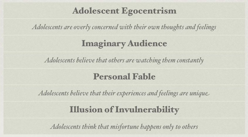 Lesson 22 Discussion Tell a story from your own adolescence, or the life of a current adolescent, or the life of your subject, which exemplifies one of Elkind's adolescent thinking styles...be explicit so it is CLEAR that the story relates.