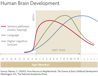 With such sophisticated brain development in the womb, there comes a huge responsibility of the parent who is carrying the fetus. There are multiple factors that can impact a baby's brain development and influence its growth. We will learn about those impacts later on in the course, but let's take a look how a baby's brain develops during the last three months in the womb (assuming healthy fetal development). As you can see in the graphic, sensory pathways (red), language (green), and higher cognitive function (blue) have all begun their development at just 6 months into the pregnancy. There is still 3 months to go so you can imagine the jumpstart that fetus is getting!