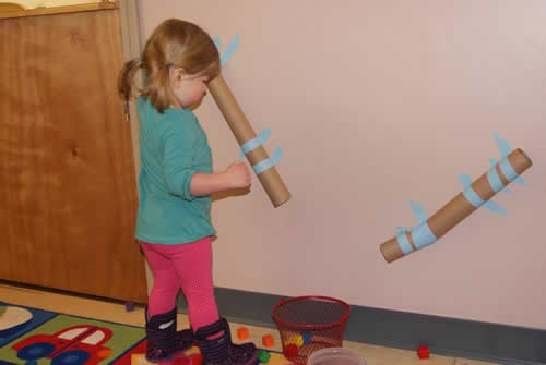 Second, let them create. Provide them with ample opportunities to use these materials. It doesn’t have to be during a specific time of day such as free play or small group activity. It can be incorporated into any activity. If they are painting, they can imagine and draw “blueprints” for a new bridge. In the dramatic play area, add the book, If I Built a House by Chris Van Dusen (a Maine author by the way) along with a box and materials to make a house. On a blank wall, tape up some cardboard tubes and put a basket at the bottom with objects that will fit in the tube. You could even just put a water wheel in the sink!