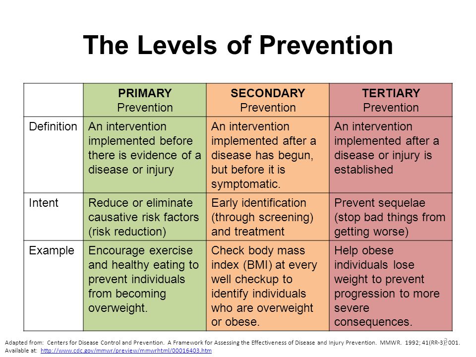 ________________________________________________________________________________________________________________ Types of Prevention Initiatives (From https://www.iwh.on.ca/wrmb/primary-secondary-and-tertiary-prevention) Prevention is different from intervention and treatment in that it is aimed at general population groups with various levels of risk for any problem. Primary prevention aims to prevent disease or injury before it ever occurs. This is done by preventing exposures to hazards that cause disease or injury, altering unhealthy or unsafe behaviours that can lead to disease or injury, and increasing resistance to disease or injury should exposure occur. Examples include: