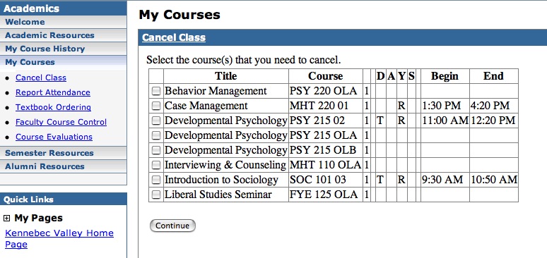 Canceling a Class On the left you see a link titled "Cancel Class"...click this link. When you click this linkyou get a list of your current classes...check the box next to the name of the class you want to cancel and press "Continue"