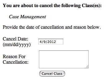 After you press the "Continue" button you will be asked to enter a data and a reason for the cancelation. Copies of this cancelation are posted on the website, sent to students, sent to the Department Chair and the Academic Dean, and a copy is sent to your email. The reason for the cancelation is not posted on the website nor is it communicated to students.