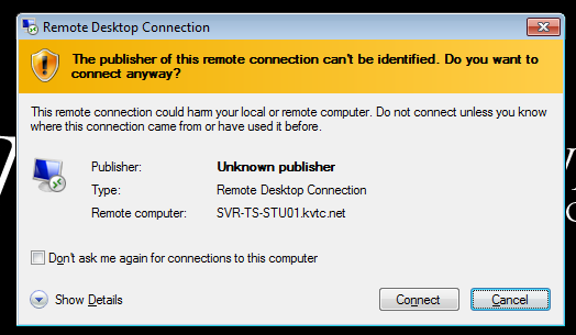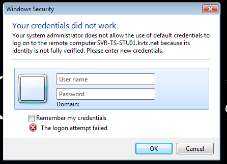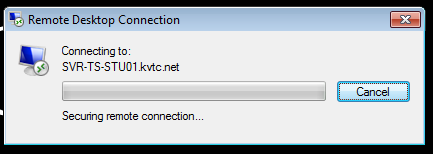 THIS IS CRITICAL INFORMATION Your USER NAME will be your regular KVCC log in user name except instead of the "kvcc.me.edu" part, you need to place "kvtc.net" At this point the screen will show that you are logging into the RDC and when that is complete you will be able to use the computer just like any other system on campus.